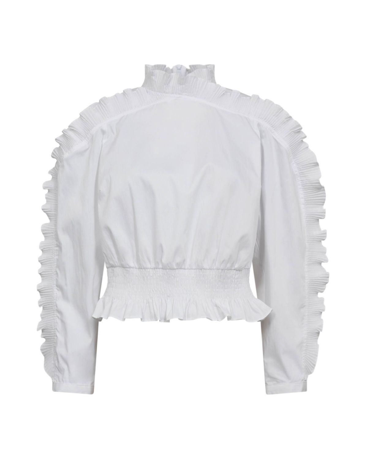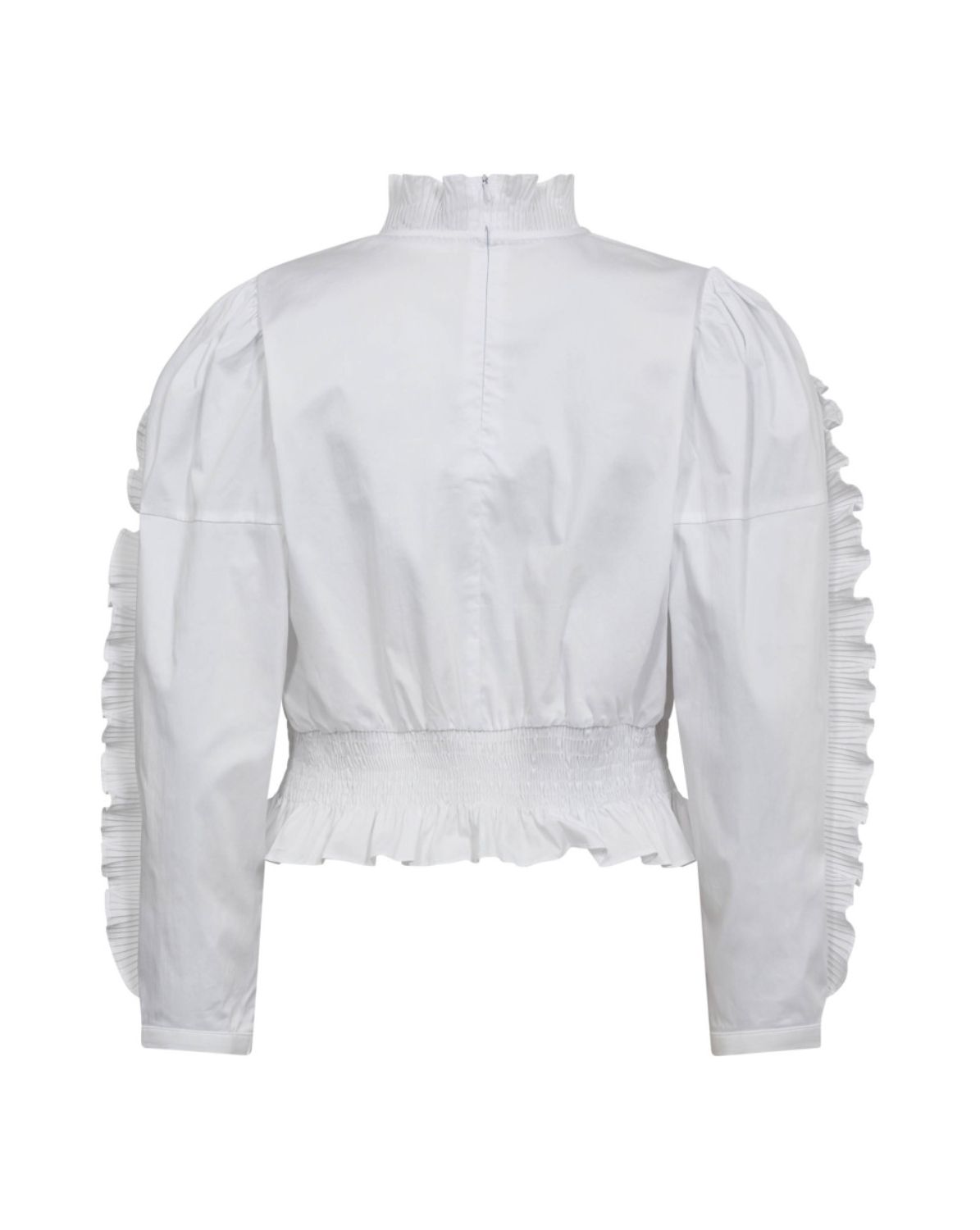 Co'Couture Blouse SannaCC Ruffle Smock White Deze romantische witte blouse van Co'Couture is een echte eyecatcher door de fijne details en vrouwelijke vorm. Het model heeft een hoge kraag met ruches, geplooide details langs de schouders en mouwen, én een gesmockte taille en zoom die prachtig aansluit op het lichaam. De luchtige katoenmix maakt deze blouse perfect voor zowel een casual als meer geklede look.Pasvorm: Aansluitend in de taille met volumineuze mouwenSluiting: Ritssluiting aan de achterkantTip van ons: Draag deze blouse met een high-waisted jeans en minimalistische hakken voor een elegante en moderne uitstraling. Voeg een leren crossbodytas toe voor een urban chic vibe.35895-SannaCC-Ruffle-Smock-Blouse-4000LDHMODA: 023718