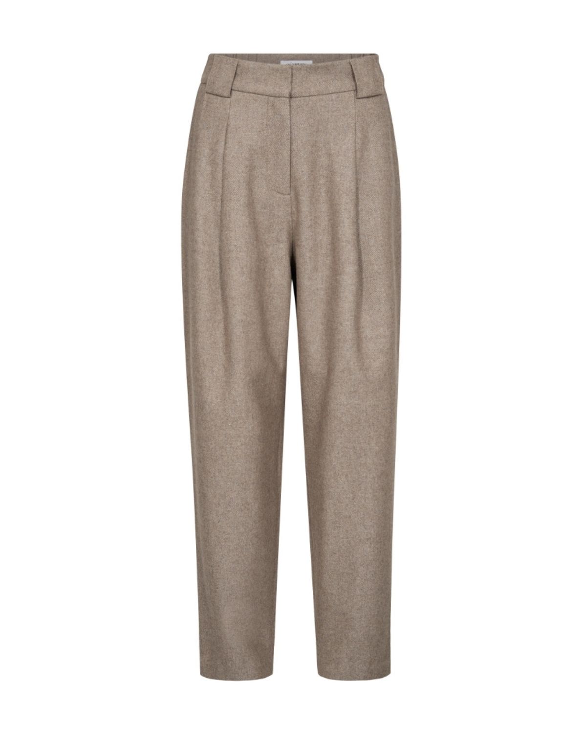 Co'Couture MeeraCC Pantalon WalnutDe Co'Couture Meera pantalon is een high-waist essential voor vrouwen die houden van een stijlvolle, tijdloze look met een moderne finesse. De gemêleerde wolblend geeft de broek een rijke, warme uitstraling en zorgt voor een mooie, elegante valling. Dankzij de tapered fit sluit de pantalon mooi aan in de taille en heup, terwijl het been iets taps toeloopt voor een verfijnd silhouet dat geschikt is voor zowel werk als vrije tijd. De combinatie van een knoop- en ritssluiting, een subtiele schuifknoop en een elastische band aan de achterkant zorgt voor draagcomfort zonder afbreuk te doen aan de luxe uitstraling. Deze pantalon voelt stevig en kwalitatief aan door het mid-weight materiaal zonder stretch.Materiaal: 50% wol en 50% polyester in een gemêleerd dessin dat het item een luxe, warme look geeft.Pasvorm: High-waisted met een tapered fit die elegant toelopt en het figuur mooi accentueert.Sluiting: Ritssluiting met knoop en schuifknoop, aangevuld met een elastische band voor extra draagcomfort.Styling tip van ons: Combineer deze pantalon met een zachte knit in een neutrale tint voor een rustige, stijlvolle look of draag er een satijnen blouse en hakken bij voor een verfijnde outfit die perfect is voor kantoor of een diner.Shop online via www.ldhmoda.nl of kom langs in onze winkel in Venlo voor persoonlijk advies.LDHMODA: 02388531590 MeeraCC-Walnut
