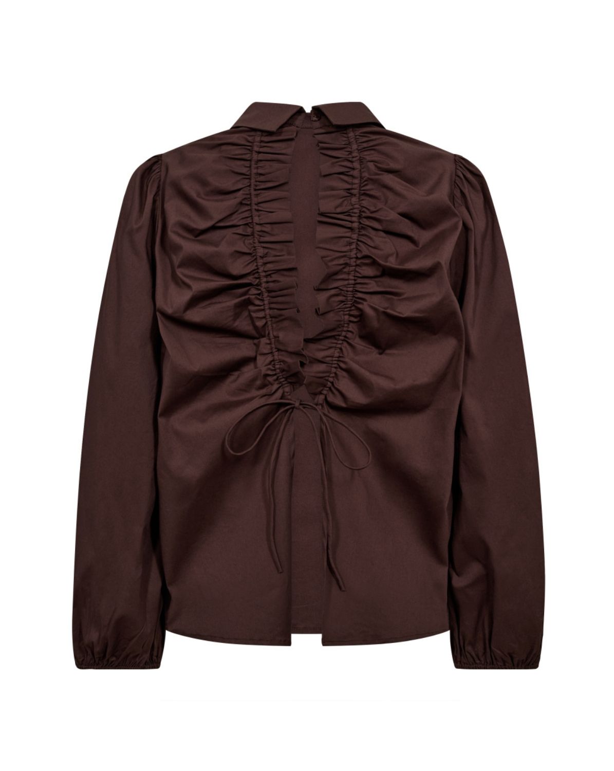 Co'Couture SannaCC Drawstring Blouse BrownDe SannaCC Drawstring Blouse van Co'Couture is een elegante blouse met een moderne twist. Deze bruine blouse is ontworpen met subtiele plooien aan de schouders en elastische manchetten voor een vrouwelijke, licht gepofte mouw. De echte eyecatcher zit aan de achterkant: een verfijnd rijgdetail dat zorgt voor een unieke, flatterende vorm en een speelse uitstraling. Pasvorm: Rechte pasvorm met verstelbaar rijgdetail aan de achterkant.Sluiting: Knoopsluiting aan de achterzijde van de hals.Styling tip van ons: Combineer deze blouse met een hoge pantalon of een leren rok voor een verfijnde, maar eigentijdse look. Ook mooi onder een blazer of losjes in een jeans voor een casual-chique outfit.Shop online via www.ldhmoda.nl of kom langs in onze winkel in Venlo voor persoonlijk advies. LDHMODA: 024246