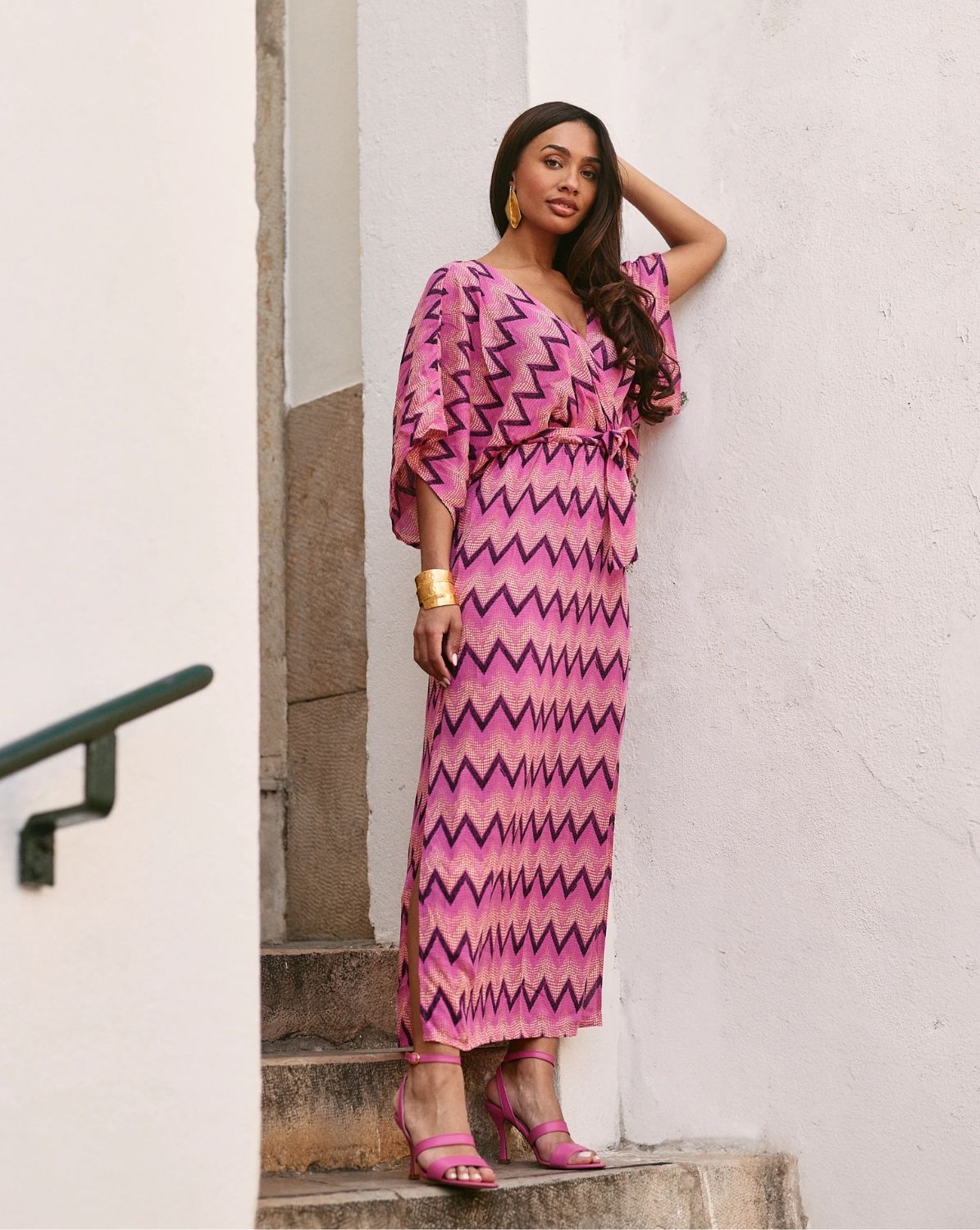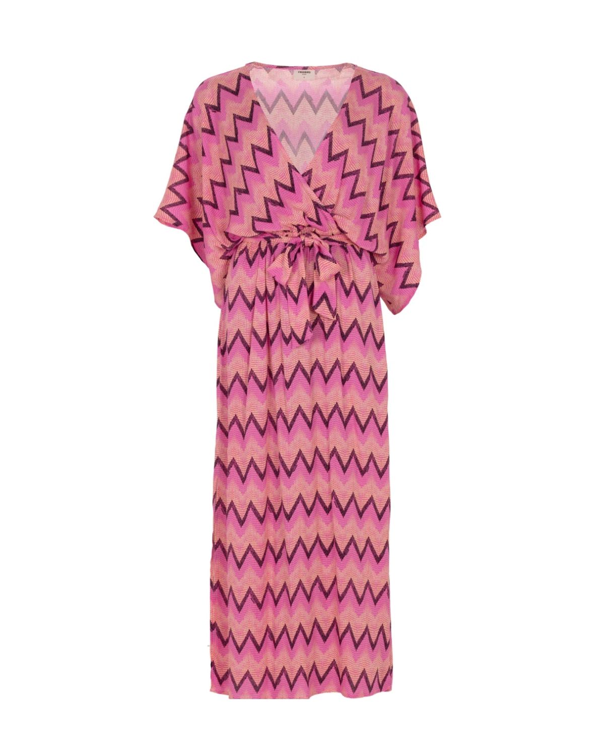 FreeBird Dalana Maxi Dress pinkLaat jezelf stralen in onze soepelvallende jurk met een prachtige zigzag print! Met zijn kimono sleeves, v-hals en ceintuur om de taille te accentueren, is deze jurk een ware blikvanger. Of je nu op vakantie gaat of een avondje uit plant, dit veelzijdige item is jouw perfecte metgezel. Het eerste model is 177 cm lang en draagt maat S, terwijl het tweede model 170 cm lang is en ook maat S draagt. Gemaakt van hoogwaardige viscose (100%), biedt deze jurk niet alleen comfort, maar ook een flatterende pasvorm. Voeg deze trendy jurk toe aan je garderobe en straal bij elke gelegenheid!ldhmoda: 021853